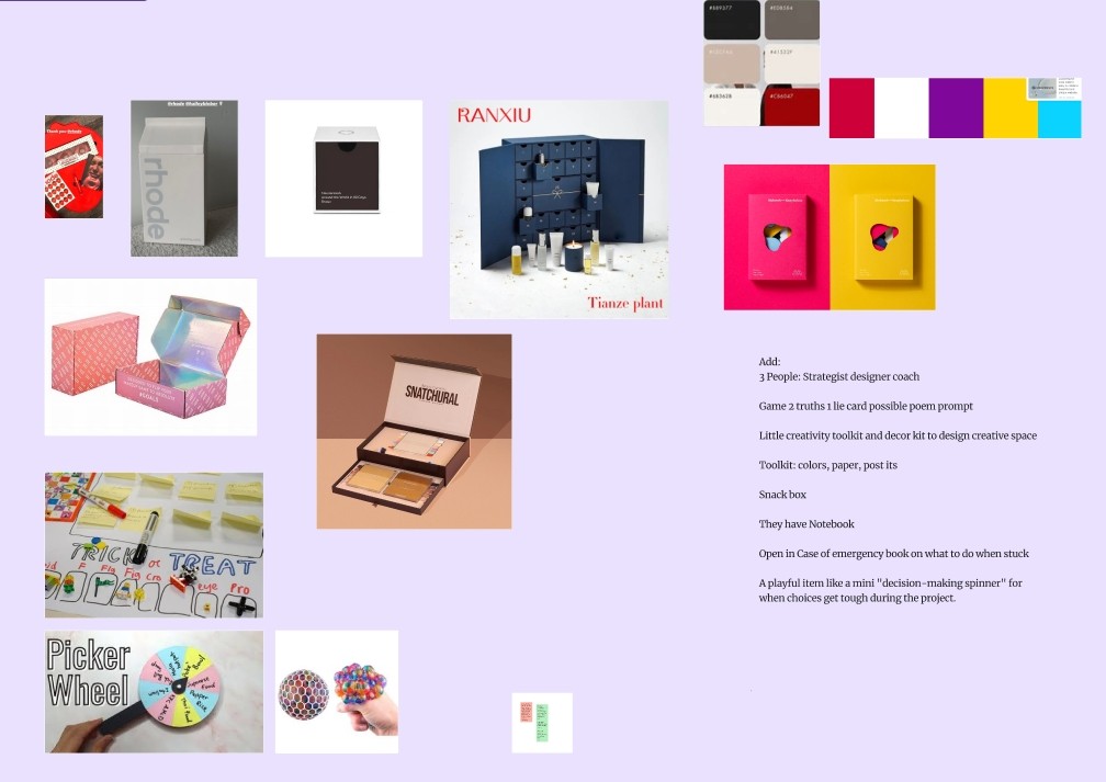 We iterated on two box styles: one chic outside with a fun/playful inside, and the other playful throughout. Initial feedback praised the personality but advised us to push the weirdness further and integrate the five senses. We also wanted the box to encourage the client to get excited to have the opportunity to think creatively with the designer.
