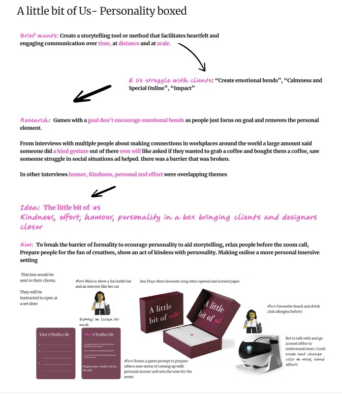 Concept Creation: Interviewed users across cultures; identified humour, kindness, and vulnerability as key. Proposed a personalised sensory box to foster authentic connection.