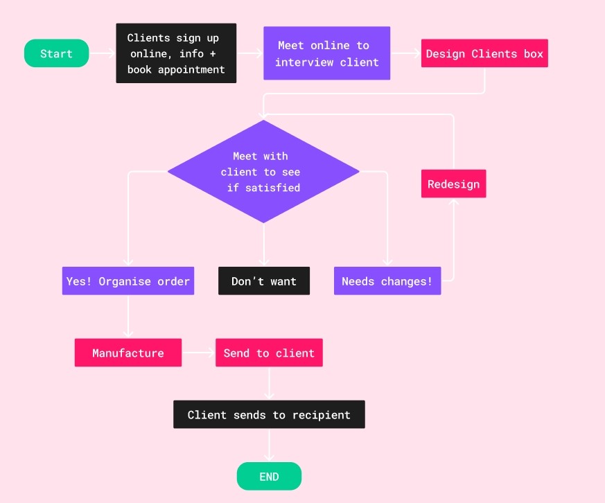 We also explored how to position this as a real-world tool by creating a service flow chart . A mock business model for a company helping designers send personalised connection kits to clients.